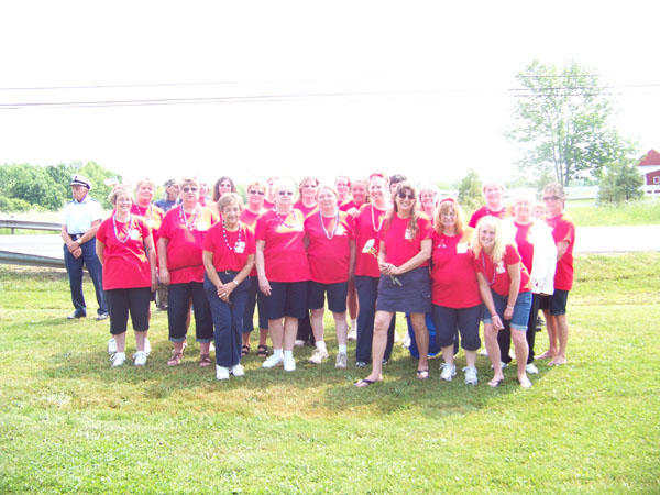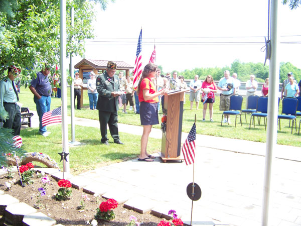 This year it was fearful as to whether or not there would be a parade as Mother Nature was sending rain along with the clap of thunder and streaking bolts of lightning. We all know that we do not mess or march with Mother Nature when she is doing that!! After about a half hour delay the sun came out and we were able to start the parade. Only hitch was our Golf Cart's Battery died driven by John Muoio AKA "Cuz", and passenger and Veteran Nick Peterson and had to be towed by the Float. No problem! Our Float Theme this year was POW/MIA and was decorated with the POW/MIA Flag and the Missing Man's Table. Twenty-two sisters either marched or rode on the float. The marching ladies handed out over 100 flags to the children along the parade route. We also had teenage children of members doing a Buddy Poppy Drive along the parade route.We had a short stop in front of Kinney's to pay respect to the World War Monuments out back and then continued onto the Cemetery for services and then back to our Memorial Site for our services.